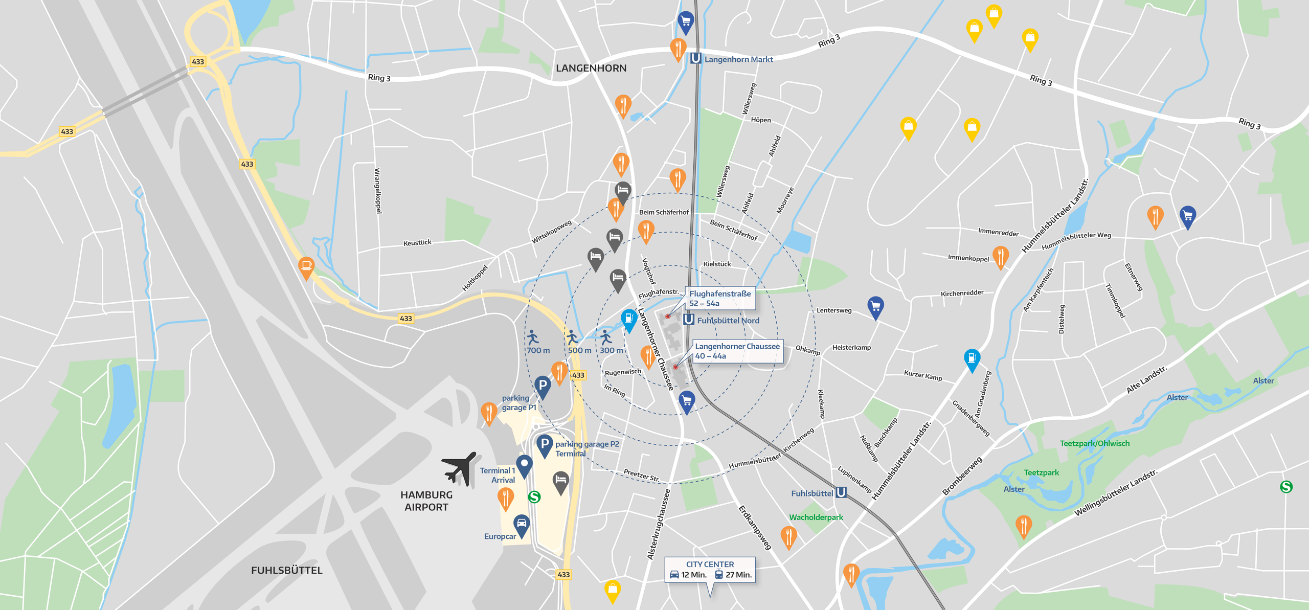 Thanks to the close proximity to Hamburg Airport, these commercial spaces are ideal for global companies. Terminals 1 and 2 can be reached on foot in only ten minutes; and the A7 motorway in just under twenty minutes away by car.